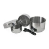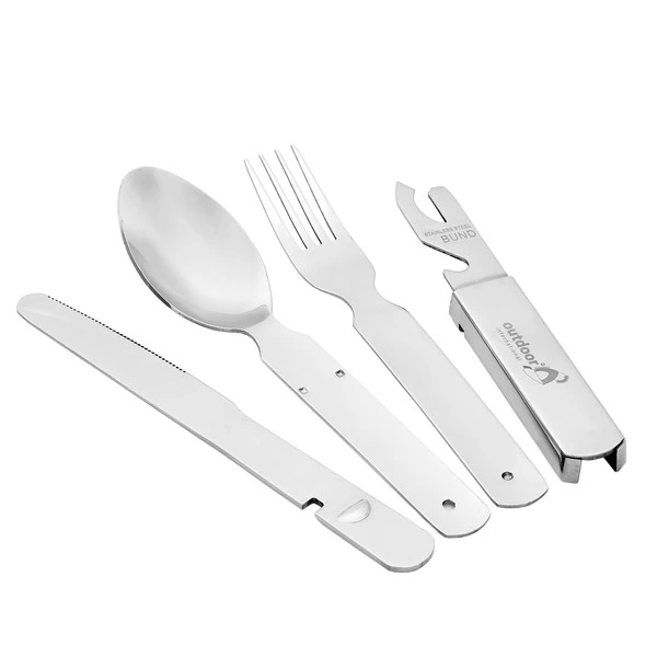 Klassische Edelstahl-Ausführung in Anlehnung an das berühmte Bundeswehr-Besteck: Messer, Gabel und Löffel arretieren in der Halterung, die du auch als Dosen- und Flaschenöffner verwenden kannst.