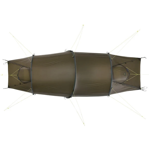 - Mittig eingehängtes Innenzelt mit je einer Apsis im Fuß- und Kopfbereich