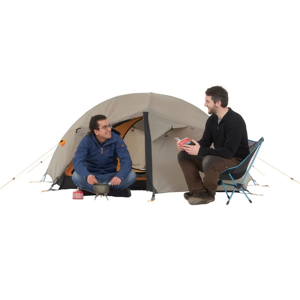 Das Venture 3 ist ein solides und dennoch preisgünstiges Kuppelzelt, das sich für eine Vielzahl von Outdooraktivitäten eignet. Im Gegensatz zu den kleineren Modellen ist es nicht freistehend und muss zum Aufstellen mit mehreren Heringen fixiert werden. Dafür bietet es durch die ebenfalls steilen Wände am meisten Platz im Innenzelt und der Apsis. Die hybride Stangenkonstruktion spannt das Innenzelt, welches zuerst aufgebaut wird, weit auf, um auch im Kopfbereich viel Bewegungsfreiheit zu ermöglichen.